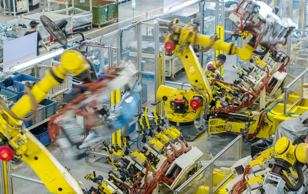 浙江省湖州市長興經(jīng)濟技術(shù)開發(fā)區(qū)的長興地通汽車部件有限公司技術(shù)人員操控工業(yè)機器人生產(chǎn)新能源汽車配件(無人機照片,2025年10月9日攝)。新華社發(fā)(譚云俸 攝)