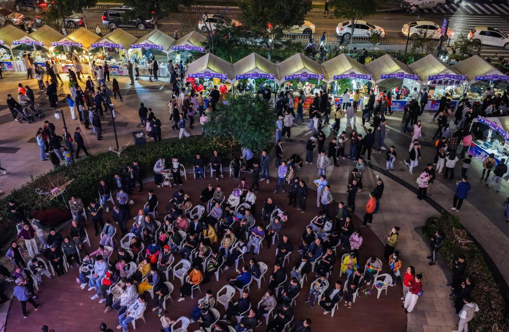 11月7日,依托當(dāng)晚在西施籃球中心舉辦的系列演唱會,“陶你所需·朱市云集”社區(qū)共富市集吸引了大批市民游客(無人機(jī)照片)。新華社記者 徐昱 攝