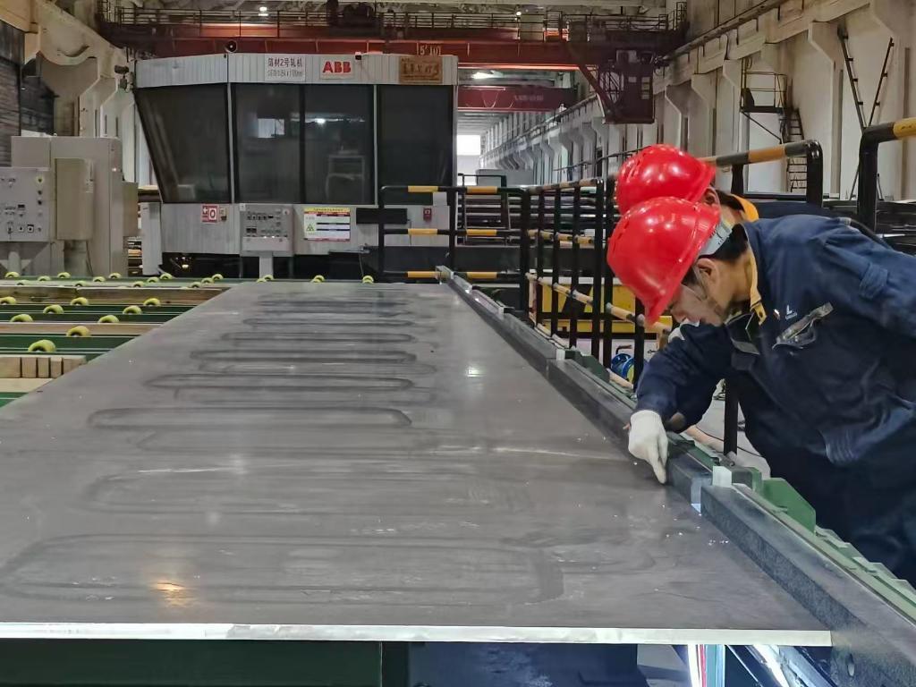 重慶西南鋁機(jī)電設(shè)備工程有限公司鋁材精深加工基地的檢測線上,技術(shù)人員在對(duì)LNG船板的直線度進(jìn)行抽檢。(受訪者供圖)