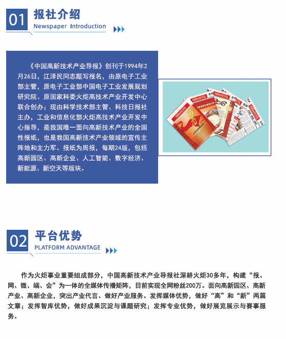 《中國(guó)高新技術(shù)產(chǎn)業(yè)導(dǎo)報(bào)》創(chuàng)刊于1994年2月26日,江澤民同志題寫報(bào)名,由原電子工業(yè)部主管,原電子工業(yè)部中國(guó)電子工業(yè)發(fā)展規(guī)劃研究院、原國(guó)家科委火炬高技術(shù)產(chǎn)業(yè)開發(fā)中心聯(lián)合創(chuàng)辦;現(xiàn)由科學(xué)技術(shù)部主管、科技日?qǐng)?bào)社主辦,工業(yè)和信息化部火炬高技術(shù)產(chǎn)業(yè)開發(fā)中心指導(dǎo),是我國(guó)唯一面向高新技術(shù)產(chǎn)業(yè)的全國(guó)性報(bào)紙,也是我國(guó)高新技術(shù)產(chǎn)業(yè)領(lǐng)域的宣傳主陣地和主力軍。報(bào)紙為周報(bào),每期16版,包括高新園區(qū)、高新企業(yè)、人工智能、數(shù)字經(jīng)濟(jì)、新能源、新空天等版塊。