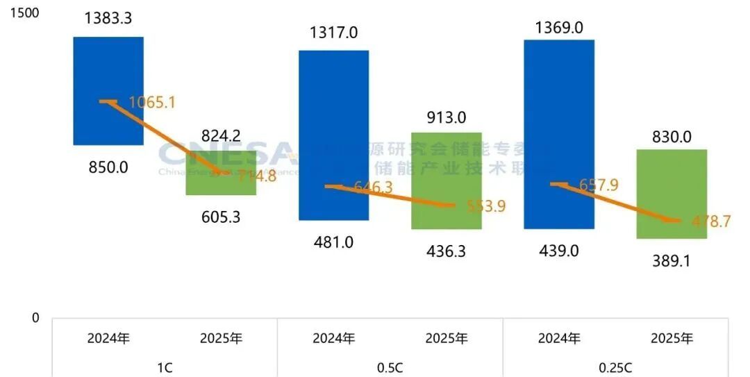 根據(jù)CNESA DataLink全球儲(chǔ)能數(shù)據(jù)庫(kù)的不完全統(tǒng)計(jì),2025年儲(chǔ)能系統(tǒng)(磷酸鐵鋰系統(tǒng),不含用戶側(cè)應(yīng)用)采購(gòu)中標(biāo)價(jià)格在391.14-913.00元/kWh之間,其中不同時(shí)長(zhǎng)系統(tǒng)價(jià)格降價(jià)幅度差異大。0.25C儲(chǔ)能系統(tǒng)價(jià)格下降幅度接近0.5C的兩倍。2025年EPC(不含用戶側(cè))中標(biāo)價(jià)格呈現(xiàn)出波動(dòng)下行的趨勢(shì),2h EPC的中標(biāo)均價(jià)已降至1043.82元/kWh,同比下降13.04%;4h EPC的中標(biāo)均價(jià)為935.40元/kWh,同比下降8.19%。