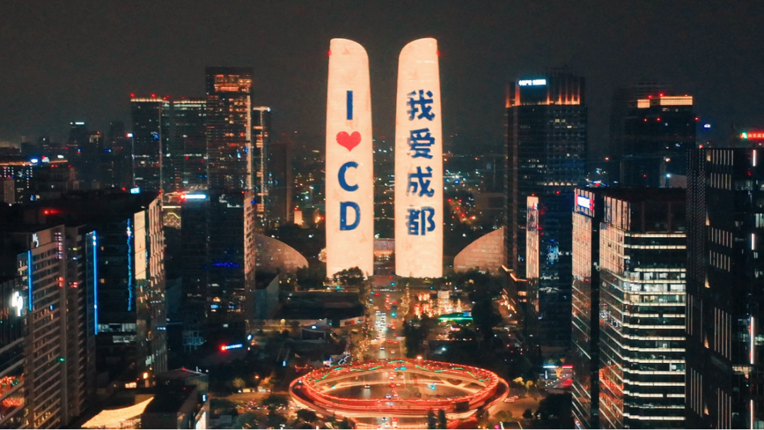 夜間,天府雙塔變身巨大屏幕,主題光影秀科技感與時(shí)尚感交融,點(diǎn)亮城市夜空,形成流光溢彩、璀璨奪目的視覺盛宴。