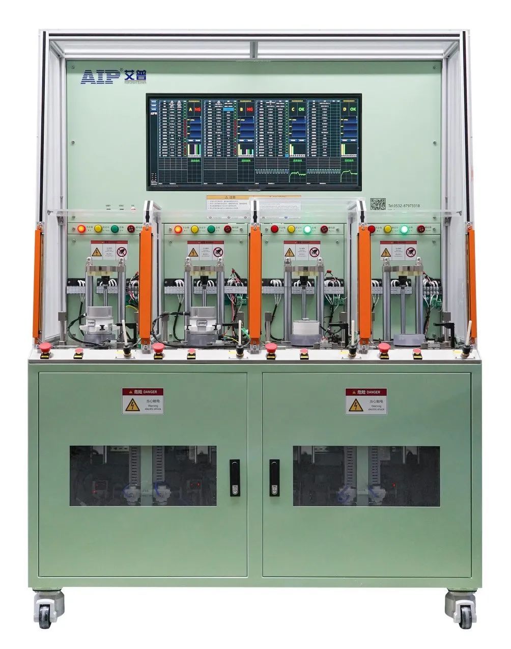 針對(duì)這一需求,艾普智能組建專(zhuān)業(yè)團(tuán)隊(duì),經(jīng)深入技術(shù)論證后,定制開(kāi)發(fā)了一套四工位并行測(cè)試系統(tǒng)。該系統(tǒng)采用四工位同步測(cè)試設(shè)計(jì),能夠?qū)崿F(xiàn)高效并行測(cè)試,可一次性完成負(fù)載測(cè)試、霍爾特性、反電動(dòng)勢(shì)、轉(zhuǎn)速、轉(zhuǎn)向、缺相、交流耐壓、絕緣電阻等多項(xiàng)測(cè)試項(xiàng)目,大幅提升測(cè)試效率?;谀K化設(shè)計(jì),一套設(shè)備即可滿足直流電機(jī)與交流電機(jī)的測(cè)試需求,顯著降低客戶設(shè)備采購(gòu)與管理成本。此外,智能化管理方面,該設(shè)備支持與工廠MES系統(tǒng)對(duì)接,具備遠(yuǎn)程診斷和軟件升級(jí)功能,可實(shí)現(xiàn)測(cè)試數(shù)據(jù)的實(shí)時(shí)上傳與分析,快速響應(yīng)客戶需求。