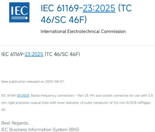 近日,從國(guó)際電工委員會(huì)(IEC)傳來(lái)令人振奮的消息:由蘇州華旃航天電器有限公司(以下簡(jiǎn)稱(chēng)“蘇州華旃”)主導(dǎo)制定的IEC61169-23:2025《射頻連接器第23部分:接3.5mm硬精密同軸線、外導(dǎo)體內(nèi)徑為3.5mm(0.1378in)的射頻同軸連接器》國(guó)際標(biāo)準(zhǔn)正式發(fā)布!這不僅是中國(guó)企業(yè)在國(guó)際射頻連接器領(lǐng)域話語(yǔ)權(quán)的重大突破,更是蘇州高新區(qū)以高標(biāo)準(zhǔn)助推高端裝備制造邁進(jìn)的新里程碑。