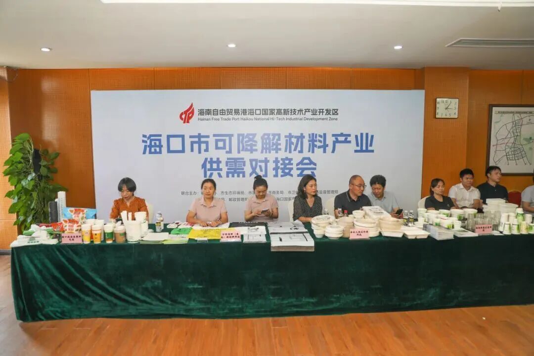 5月,海口高新區(qū)聯(lián)合多部門舉辦的??谑锌山到獠牧袭a(chǎn)業(yè)供需對接會在美安生態(tài)科技新城舉行,為園區(qū)8家可降解材料生產(chǎn)企業(yè)與??谑嗅t(yī)院診所、商超、餐飲、農(nóng)貿(mào)市場、物流企業(yè)等80余家企、事業(yè)單位代表搭建起合作交流的平臺。