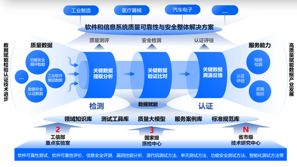 工業(yè)和信息化部電子第五研究所華東分所(中國賽寶(華東)實驗室)牽頭建設(shè)的“面向信息系統(tǒng)與產(chǎn)品質(zhì)量安全檢測認證公共服務(wù)示范平臺”用數(shù)據(jù)賦能檢測認證,提供信息系統(tǒng)測試、數(shù)據(jù)安全評估、信息技術(shù)服務(wù)能力認證等服務(wù)。