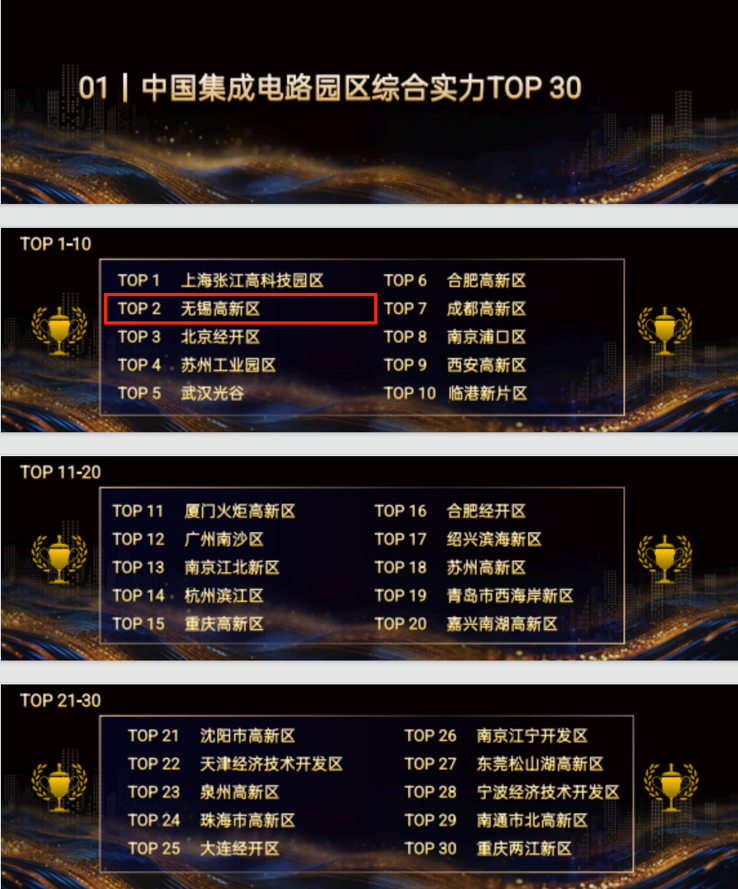 12月20日,由中國半導(dǎo)體投資聯(lián)盟主辦、愛集微承辦的2026半導(dǎo)體投資年會暨IC風(fēng)云榜頒獎典禮在上海舉行?;顒蝇F(xiàn)場正式發(fā)布了《中國集成電路園區(qū)綜合實(shí)力TOP30》,無錫高新區(qū)位列全國第二,僅次于上海張江高科技園區(qū),這是無錫高新區(qū)連續(xù)第4次蟬聯(lián)此項殊榮,同時無錫高新區(qū)再度獲評“年度最佳集成電路園區(qū)獎”。