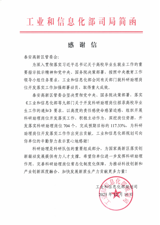 近日,工業(yè)和信息化部向泰安高新區(qū)發(fā)來感謝信,對泰安高新區(qū)在科研助理崗位開發(fā)落實(shí)工作中作出的突出貢獻(xiàn)和顯著成效予以充分肯定。