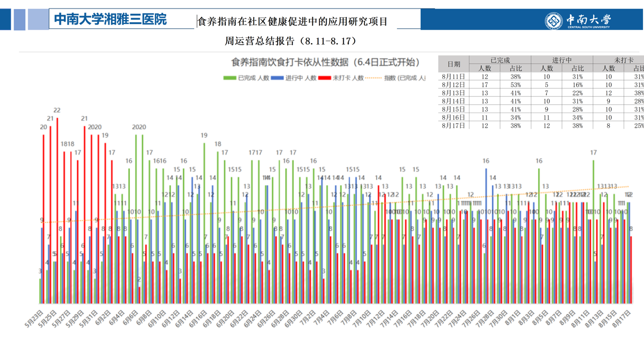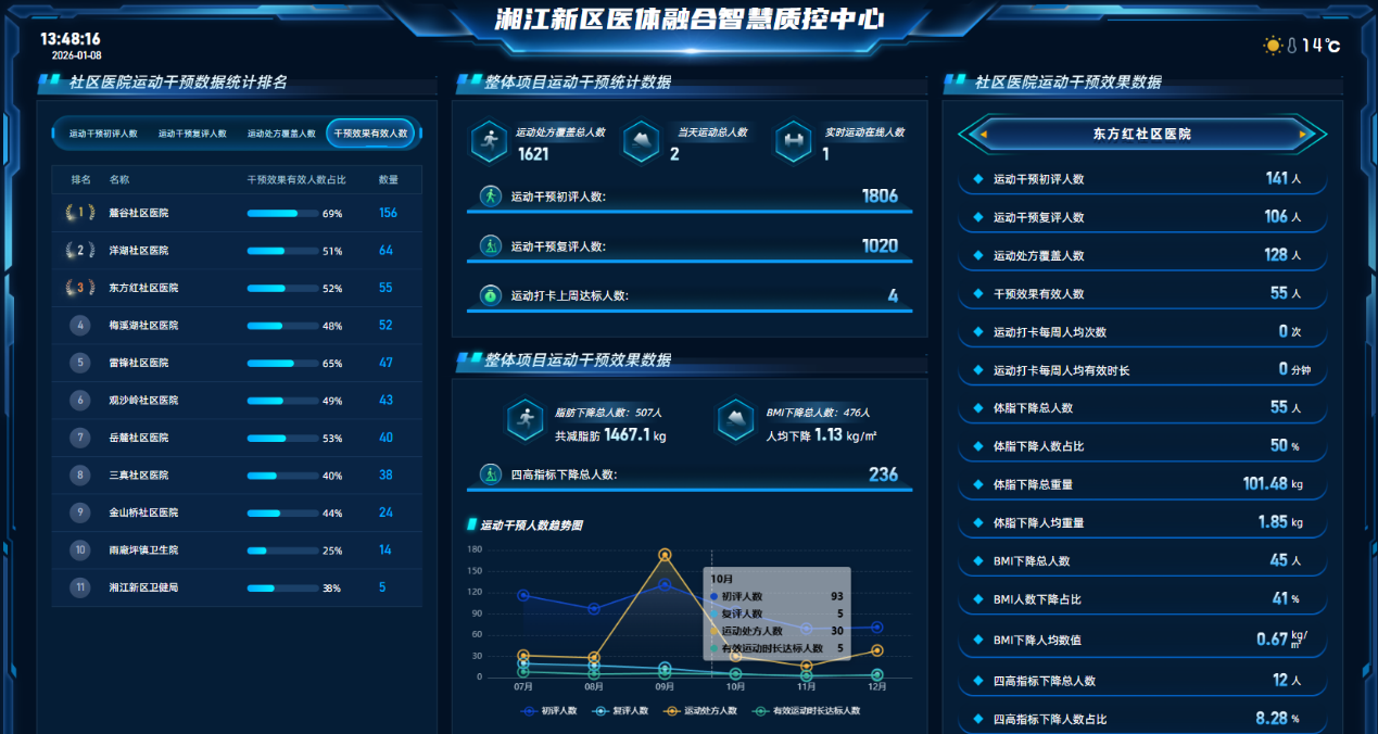 參與東方紅街道社區(qū)衛(wèi)生服務(wù)中心醫(yī)體融合項(xiàng)目的廖翠華通過運(yùn)動(dòng)實(shí)現(xiàn)了從超重到標(biāo)準(zhǔn)的蛻變。楊婷也在社區(qū)監(jiān)督下瘦了十幾斤,完成了夏天穿衣服更好看的心愿,找到了對(duì)身體的掌控感。目前,湘江新區(qū)共有10個(gè)基地招募重點(diǎn)人群進(jìn)行運(yùn)動(dòng)干預(yù),在運(yùn)動(dòng)干預(yù)有效人數(shù)中,BMI下降人數(shù)占比約60%,且顯著改善“四高”人群相關(guān)生化指標(biāo)。