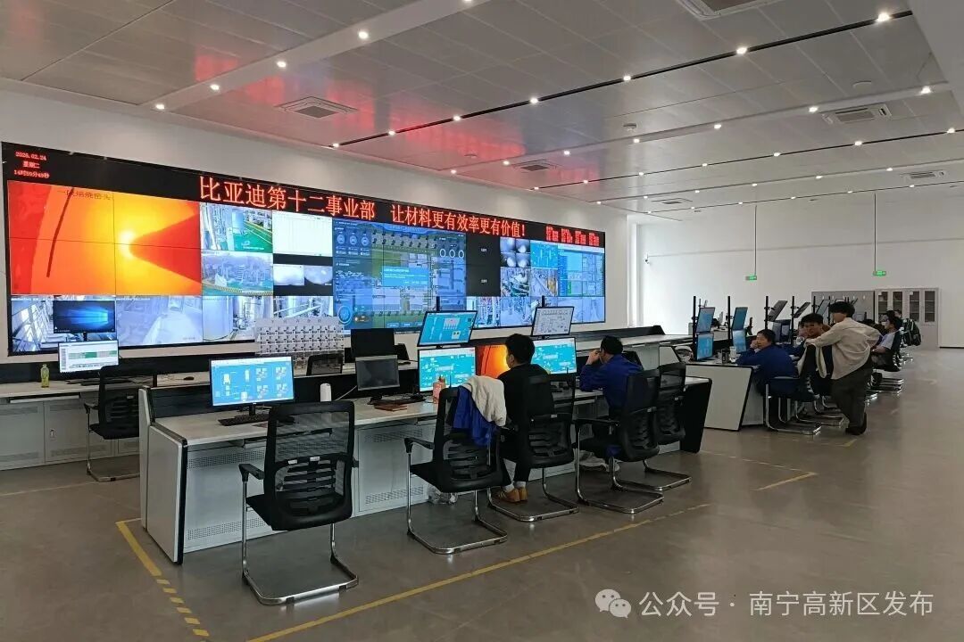 在東部新城,南寧比亞迪新材料有限公司監(jiān)控室內(nèi),技術(shù)人員正在緊盯設(shè)備運(yùn)行情況。