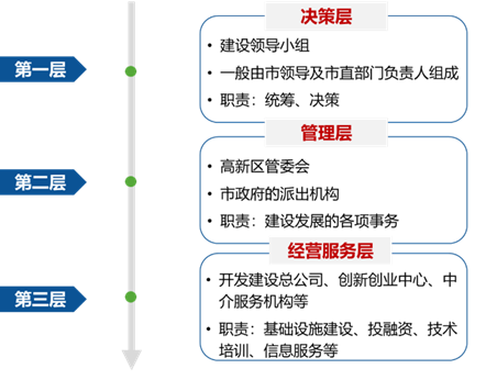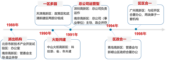 1988年,國(guó)務(wù)院批準(zhǔn)實(shí)施火炬計(jì)劃,明確把創(chuàng)辦高新區(qū)作為火炬計(jì)劃的重要內(nèi)容;同年,批準(zhǔn)建立第一個(gè)國(guó)家高新區(qū)——北京市新技術(shù)產(chǎn)業(yè)開(kāi)發(fā)試驗(yàn)區(qū)(以下簡(jiǎn)稱“北京試驗(yàn)區(qū)”),也就是中關(guān)村科技園區(qū)的前身,批準(zhǔn)頒布《北京市新技術(shù)產(chǎn)業(yè)開(kāi)發(fā)試驗(yàn)區(qū)暫行條例》,拉開(kāi)了我國(guó)建設(shè)國(guó)家高新區(qū)的序幕。北京市政府根據(jù)該《暫行條例》發(fā)布實(shí)施細(xì)則,明確規(guī)定北京市試驗(yàn)區(qū)辦公室是海淀區(qū)人民政府的派出機(jī)構(gòu) ,在海淀區(qū)人民政府領(lǐng)導(dǎo)和市科委指導(dǎo)監(jiān)督下,具體辦理新技術(shù)企業(yè)的審批核定事宜。同年7月,為加強(qiáng)對(duì)北京試驗(yàn)區(qū)的領(lǐng)導(dǎo)和協(xié)調(diào)工作,北京市政府牽頭組建了北京試驗(yàn)區(qū)協(xié)調(diào)委員會(huì) ,由北京市副市長(zhǎng)任委員會(huì)主任,北京試驗(yàn)區(qū)辦公室兼協(xié)調(diào)委員會(huì)辦公室職能。北京試驗(yàn)區(qū)的建設(shè)模式為后來(lái)國(guó)家高新區(qū)組建領(lǐng)導(dǎo)小組,成立作為政府派出機(jī)構(gòu)的管委會(huì)奠定了重要基礎(chǔ)。在中關(guān)村科技園區(qū)成功探索的基礎(chǔ)上,1991年和1992年,國(guó)務(wù)院先后批準(zhǔn)建立了51家國(guó)家高新區(qū),全面啟動(dòng)國(guó)家高新區(qū)建設(shè)。為貫徹落實(shí)黨中央、國(guó)務(wù)院的指示精神,1991年,原國(guó)家科委和國(guó)家體改委研究制定了《關(guān)于深化高新技術(shù)產(chǎn)業(yè)開(kāi)發(fā)區(qū)改革,推進(jìn)高新技術(shù)產(chǎn)業(yè)發(fā)展的決定》,進(jìn)一步明確了國(guó)家高新區(qū)改革的基本方向、原則和思路,明確國(guó)家高新區(qū)要根據(jù)發(fā)展社會(huì)主義有計(jì)劃商品經(jīng)濟(jì)的要求,建立起符合商品經(jīng)濟(jì)運(yùn)行規(guī)律,適應(yīng)高新技術(shù)產(chǎn)業(yè)發(fā)展要求和國(guó)際慣例的體制、機(jī)制;各開(kāi)發(fā)區(qū)要因地制宜地建立決策、管理機(jī)構(gòu),賦予相應(yīng)的權(quán)限,代表當(dāng)?shù)卣惺剐姓殭?quán), 統(tǒng)一對(duì)內(nèi)對(duì)外,集中有效地協(xié)調(diào)解決開(kāi)發(fā)區(qū)發(fā)展中的重大問(wèn)題,并在工商、稅務(wù)、財(cái)政、金融、國(guó)際合作交流、外貿(mào)、進(jìn)出口等方面形成配套、高效的服務(wù)功能,為企業(yè)提供綜合服務(wù)。在1988年到2000年的“一次創(chuàng)業(yè)”階段,國(guó)家高新區(qū)發(fā)展到53家,成為我國(guó)高新技術(shù)的集聚地和成果轉(zhuǎn)化、產(chǎn)業(yè)發(fā)展的增長(zhǎng)極。由于這一階段高新技術(shù)產(chǎn)業(yè)發(fā)展基礎(chǔ)總體薄弱,需要強(qiáng)有力的管理機(jī)構(gòu)創(chuàng)造發(fā)展環(huán)境,同時(shí)借鑒了當(dāng)時(shí)國(guó)家經(jīng)開(kāi)區(qū)的管理經(jīng)驗(yàn),大多高新區(qū)采取較封閉的管理模式,探索集中授權(quán)管理。 初步形成了具有中國(guó)特色的“領(lǐng)導(dǎo)小組+管委會(huì)+公司” 管理架構(gòu),實(shí)行“決策層-管理層-服務(wù)層” 開(kāi)放式管理模式。其中,“決策層”即由市政府主要負(fù)責(zé)人及市政府有關(guān)行政管理部門(mén)負(fù)責(zé)人組成的領(lǐng)導(dǎo)小組,為強(qiáng)化政府的作用,一般由市級(jí)主要領(lǐng)導(dǎo)擔(dān)任領(lǐng)導(dǎo)小組組長(zhǎng)。主要負(fù)責(zé)宏觀決策、重大政策制定、用地規(guī)劃、協(xié)調(diào)解決高新區(qū)開(kāi)發(fā)建設(shè)及管理過(guò)程中的重大問(wèn)題等?!肮芾韺印奔醋鳛檎沙鰴C(jī)構(gòu)的管委會(huì),代表當(dāng)?shù)卣惺拐殭?quán),對(duì)園區(qū)實(shí)行統(tǒng)一領(lǐng)導(dǎo),負(fù)責(zé)具體發(fā)展規(guī)劃、建設(shè)和管理等職責(zé)。“服務(wù)層”即設(shè)立園區(qū)開(kāi)發(fā)建設(shè)公司、創(chuàng)新創(chuàng)業(yè)中心等,負(fù)責(zé)園區(qū)基礎(chǔ)設(shè)施建設(shè)、投融資、創(chuàng)業(yè)孵化等功能。實(shí)踐中,各國(guó)家高新區(qū)也結(jié)合自身實(shí)際情況,逐步探索適宜區(qū)域特征、順應(yīng)市場(chǎng)經(jīng)濟(jì)發(fā)展的多樣化管理體制 。如南京高新區(qū)創(chuàng)建初期采取以管委會(huì)為主導(dǎo)的政企并存模式;海南高新區(qū)、深圳高新區(qū)采取以企業(yè)、總公司為主導(dǎo)的管理體制;桂林高新區(qū)由具有一定行政職能的事業(yè)單位來(lái)實(shí)行企業(yè)管理;中山、廈門(mén)和威海三個(gè)國(guó)家高新區(qū),由原國(guó)家科委、省科委和當(dāng)?shù)卣限k,被命名為火炬高新區(qū),在行政管理的基礎(chǔ)上,成立開(kāi)發(fā)總公司,負(fù)責(zé)高新區(qū)基礎(chǔ)設(shè)施建設(shè)、新技術(shù)產(chǎn)業(yè)投資和部分公共事務(wù)管理。