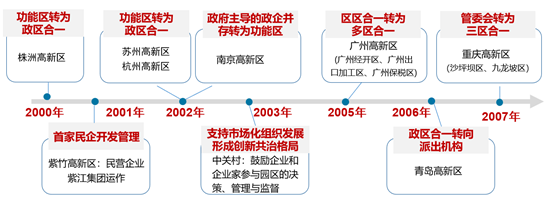 二、“二次創(chuàng)業(yè)”階段:深化“精簡(jiǎn)、高效”改革,積極探索經(jīng)濟(jì)與社會(huì)統(tǒng)籌管理機(jī)制 進(jìn)入21世紀(jì),國(guó)內(nèi)外經(jīng)濟(jì)形勢(shì)發(fā)生巨大變化,中國(guó)加入WTO,科技創(chuàng)新成為我國(guó)發(fā)展主旋律。2001年,科技部在總結(jié)前一階段國(guó)家高新區(qū)建設(shè)經(jīng)驗(yàn)的基礎(chǔ)上,研究提出了國(guó)家高新區(qū)“二次創(chuàng)業(yè)”的新任務(wù)和新目標(biāo),核心是要推進(jìn)“五個(gè)轉(zhuǎn)變”, 從第一階段的外延式發(fā)展向更加依靠科技創(chuàng)新的內(nèi)涵式發(fā)展階段轉(zhuǎn)變,更加注重“創(chuàng)新驅(qū)動(dòng)、內(nèi)生增長(zhǎng)” 。2002年,科技部印發(fā)《關(guān)于國(guó)家高新區(qū)管理體制改革與創(chuàng)新的若干意見(jiàn)》,指出國(guó)家高新區(qū)要建立適應(yīng)社會(huì)主義市場(chǎng)經(jīng)濟(jì)要求和高新技術(shù)產(chǎn)業(yè)發(fā)展規(guī)律、符合WTO規(guī)則的管理體制和運(yùn)行機(jī)制,國(guó)家高新區(qū)管理機(jī)構(gòu)要按照“精簡(jiǎn)、高效、優(yōu)質(zhì)”的原則不斷推進(jìn)職能轉(zhuǎn)變 ,進(jìn)一步提高管理效率和靈活度?!岸蝿?chuàng)業(yè)”期間,國(guó)家高新區(qū)普遍加強(qiáng)了內(nèi)涵式和外延式相結(jié)合、引進(jìn)大企業(yè)和培育小企業(yè)相結(jié)合的發(fā)展力度,不僅大力引進(jìn)國(guó)內(nèi)外研發(fā)機(jī)構(gòu)、科教資源和龍頭企業(yè)進(jìn)駐,而且著力營(yíng)造創(chuàng)新創(chuàng)業(yè)氛圍,建設(shè)不同類型的科技企業(yè)孵化器,運(yùn)用各種政策手段和市場(chǎng)力量,推動(dòng)內(nèi)生發(fā)展動(dòng)力的增長(zhǎng),形成了研發(fā)機(jī)構(gòu)密集、大企業(yè)和小企業(yè)和諧共生的產(chǎn)業(yè)鏈條。同時(shí),國(guó)家高新區(qū)也不再是單純的產(chǎn)業(yè)園區(qū),而是形成了產(chǎn)城融合的具有現(xiàn)代化形象的科技新城和城市新地標(biāo), 不僅增強(qiáng)了創(chuàng)新活力和發(fā)展實(shí)力,而且提高了示范、輻射、引領(lǐng)和帶動(dòng)作用,成為宜居宜業(yè)的創(chuàng)新創(chuàng)業(yè)高地,相應(yīng)也帶來(lái)諸多社會(huì)事務(wù)管理方面的新挑戰(zhàn) 。經(jīng)過(guò)十余年的發(fā)展,特別是產(chǎn)業(yè)規(guī)模的迅速擴(kuò)大,部分國(guó)家高新區(qū)面臨空間緊缺的瓶頸,于是采用了不同方式,擴(kuò)大管理范圍,拓展發(fā)展空間 。同時(shí),現(xiàn)實(shí)中的不完全政府模式、不明晰職能邊界導(dǎo)致的矛盾日益凸顯,管理體制機(jī)制不順成為制約國(guó)家高新區(qū)創(chuàng)新發(fā)展重要因素。為此,國(guó)家高新區(qū)先后開(kāi)啟了不同類型、不同程度的新一輪管理體制改革 。如株洲、青島、桂林、蘇州等高新區(qū)為解決空間不足、社會(huì)事務(wù)難以協(xié)調(diào)等問(wèn)題,將高新區(qū)與行政區(qū)合并或建立新區(qū);上海紫竹采用多元化的股權(quán)結(jié)構(gòu),形成民營(yíng)企業(yè)、高等院校、市區(qū)鎮(zhèn)政府“三結(jié)合”運(yùn)營(yíng)模式,成為全國(guó)首家以民營(yíng)企業(yè)為開(kāi)發(fā)主體的開(kāi)發(fā)區(qū);廣州高新區(qū)進(jìn)一步與新組建的蘿崗區(qū)合并,重慶高新區(qū)與沙坪壩區(qū)、九龍坡區(qū)等的鄉(xiāng)鎮(zhèn)街道合并實(shí)現(xiàn)擴(kuò)容升級(jí),等等;形成包括區(qū)區(qū)合一、政區(qū)合一和多區(qū)合一模式。
