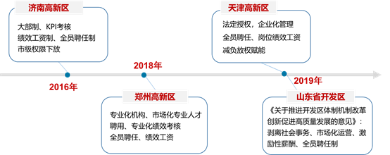 三、“創(chuàng)新驅(qū)動(dòng)戰(zhàn)略提升”階段: 加快轉(zhuǎn)變政府職能,著力推進(jìn)市場(chǎng)化改革 黨的十八大以來(lái),改革進(jìn)入了深水區(qū),開(kāi)放邁向了新階段,創(chuàng)新驅(qū)動(dòng)發(fā)展成為國(guó)家戰(zhàn)略,國(guó)家高新區(qū)進(jìn)入“創(chuàng)新驅(qū)動(dòng)、戰(zhàn)略提升”階段 。黨中央、國(guó)務(wù)院高度重視轉(zhuǎn)變政府職能,把“放管服”改革作為全面深化改革的重要內(nèi)容,持續(xù)推進(jìn)簡(jiǎn)政放權(quán),實(shí)行放管結(jié)合,優(yōu)化行政服務(wù),以市場(chǎng)在資源配置中起決定性作用和更好發(fā)揮政府作用為目標(biāo),著力破解制約科技創(chuàng)新活力的體制機(jī)制障礙。2013年,科技部出臺(tái)《國(guó)家高新區(qū)戰(zhàn)略提升行動(dòng)方案》,提出國(guó)家高新區(qū)要積極建設(shè)服務(wù)型政府,形成國(guó)家、地方、社會(huì)等各方力量聯(lián)合治理新模式。2017年2月,國(guó)務(wù)院辦公廳出臺(tái)《關(guān)于促進(jìn)開(kāi)發(fā)區(qū)改革和創(chuàng)新發(fā)展的若干意見(jiàn)》(國(guó)辦發(fā)[2017]7號(hào)),提出開(kāi)發(fā)區(qū)要將政企分開(kāi)、政資分開(kāi),行政剝離、市場(chǎng)化運(yùn)作作為下一步改革的重點(diǎn)方向。2020年7月,國(guó)務(wù)院出臺(tái)《關(guān)于促進(jìn)國(guó)家高新技術(shù)產(chǎn)業(yè)開(kāi)發(fā)區(qū)高質(zhì)量發(fā)展的若干意見(jiàn)》(國(guó)發(fā)〔2020〕7號(hào)),對(duì)國(guó)家高新區(qū)深化管理體制機(jī)制改革作出頂層設(shè)計(jì) ,要求國(guó)家高新優(yōu)化內(nèi)部管理架構(gòu),實(shí)行扁平化管理,探索崗位管理制度,實(shí)行聘用制,建立完善符合實(shí)際的分配激勵(lì)和考核機(jī)制,并賦予國(guó)家高新區(qū)相應(yīng)的省級(jí)和市級(jí)經(jīng)濟(jì)管理權(quán)限。綜合來(lái)看,我國(guó)正處于轉(zhuǎn)變發(fā)展方式、優(yōu)化經(jīng)濟(jì)結(jié)構(gòu)、轉(zhuǎn)換增長(zhǎng)動(dòng)力的攻關(guān)期,國(guó)家高新區(qū)過(guò)去依賴政策紅利、政府主導(dǎo)色彩濃厚等長(zhǎng)期積累的問(wèn)題逐漸顯露,面臨著要素成本制約、政策優(yōu)勢(shì)減弱、區(qū)域內(nèi)外競(jìng)爭(zhēng)壓力增大、發(fā)展活力不足、發(fā)展動(dòng)能減弱等困境,因此積極轉(zhuǎn)變政府職能、引入市場(chǎng)化效率機(jī)制勢(shì)在必行。圍繞“放管服”深化改革,一批國(guó)家高新區(qū)開(kāi)始積極探索符合新時(shí)代要求的行政審批、組織機(jī)構(gòu)、人事管理、薪酬激勵(lì)新機(jī)制,著力構(gòu)建精簡(jiǎn)高效的管理服務(wù)體系 。如2016年濟(jì)南高新區(qū)堅(jiān)持問(wèn)題導(dǎo)向,圍繞“企業(yè)化管理、市場(chǎng)化運(yùn)作、專業(yè)化服務(wù)”目標(biāo),推行機(jī)構(gòu)大部制、實(shí)行全員聘任制、改革干部考評(píng)體系、采用績(jī)效工資制、深化簡(jiǎn)政放權(quán),激發(fā)高新區(qū)發(fā)展創(chuàng)造力。2019年天津?yàn)I海高新區(qū)依據(jù)自身為功能區(qū)的本質(zhì),推行法定機(jī)構(gòu)改革,目標(biāo)是去除行政事業(yè)身份,全面引入市場(chǎng)化經(jīng)營(yíng)理念和企業(yè)化激勵(lì)機(jī)制。2020年,玉溪高新區(qū)、蘭州高新區(qū)等圍繞強(qiáng)化經(jīng)濟(jì)發(fā)展和創(chuàng)新促進(jìn)功能,探索開(kāi)展全員聘任制、績(jī)效考核制、薪酬激勵(lì)制等改革,以進(jìn)一步激發(fā)廣大干部的干事創(chuàng)業(yè)熱情。