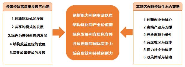 其中,“五大核心內(nèi)涵”著眼于“創(chuàng)新、協(xié)調(diào)、綠色、開放、共享”五大新發(fā)展理念,在發(fā)展動力上,強調(diào)創(chuàng)新是實現(xiàn)高質(zhì)量發(fā)展的第一動力,激發(fā)全社會創(chuàng)新潛能和創(chuàng)業(yè)活力;在發(fā)展支撐上,加快向提高供給體系質(zhì)量轉(zhuǎn)變,著力打造高質(zhì)量現(xiàn)代產(chǎn)業(yè)體系;在發(fā)展路徑上,提升全球拓展和競爭能力,形成高水平的全面開放新格局;在發(fā)展環(huán)境上,堅持以人為本、生態(tài)優(yōu)先、包容并蓄原則,營造滿足人民美好生活需要的環(huán)境;在發(fā)展績效上,強調(diào)創(chuàng)新對于發(fā)展的實際推動作用,突出高質(zhì)量發(fā)展的效率提升和經(jīng)濟成效。而“六大關(guān)鍵要素”源于創(chuàng)新經(jīng)濟生態(tài)模型和內(nèi)涵,國家高新區(qū)創(chuàng)新經(jīng)濟生態(tài)的營造,最終要形成以創(chuàng)新創(chuàng)業(yè)活動為核心、以高端產(chǎn)業(yè)為價值承載、以發(fā)達的市場網(wǎng)絡(luò)和空間為條件、以宜業(yè)宜居的城區(qū)為環(huán)境依托、以多元創(chuàng)業(yè)文化和人才組成的活力社會為要素支撐的開放和自組織的創(chuàng)新經(jīng)濟體系。這一生態(tài)構(gòu)成中,創(chuàng)新創(chuàng)業(yè)是核心觀察對象,政府政策為外部作用力,由此這也契合了學術(shù)界普遍采用的創(chuàng)新生態(tài)六要素模型,即:創(chuàng)新創(chuàng)業(yè)、產(chǎn)業(yè)、市場、文化、社會和政策。