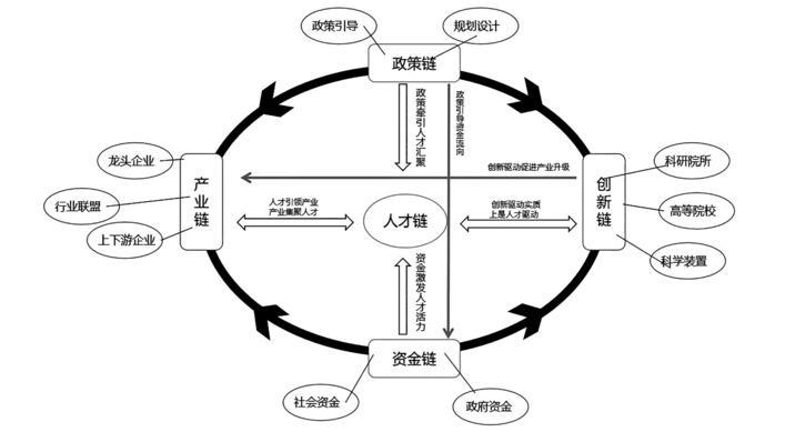 人才鏈、創(chuàng)新鏈、產(chǎn)業(yè)鏈、政策鏈、資金鏈“五鏈”融合的過程,其實是政產(chǎn)學研金等各類創(chuàng)新主體協(xié)同發(fā)展的過程,其共同形成地區(qū)發(fā)展資源、環(huán)境、物質(zhì)和生態(tài)的大系統(tǒng),最終構建人才引領發(fā)展的經(jīng)濟形態(tài)或者稱之為人才經(jīng)濟。“五鏈”融合的關鍵在于突出人才引領、多鏈協(xié)同、共同發(fā)展,需要堅持相互聯(lián)系協(xié)調(diào)發(fā)展的整體機制,建立要素互聯(lián)互通的流通渠道,更高標準和站位,對地區(qū)的人才、資金、創(chuàng)新、產(chǎn)業(yè)和政策進行科學的布局謀劃,打破地區(qū)的內(nèi)耗與壁壘,形成區(qū)域發(fā)展合力。