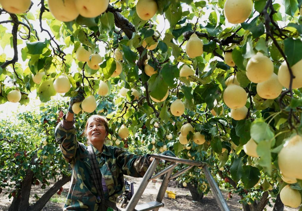 9月13日,河北省晉州市的農(nóng)民在果園采摘鴨梨。新華社記者楊世堯 攝
