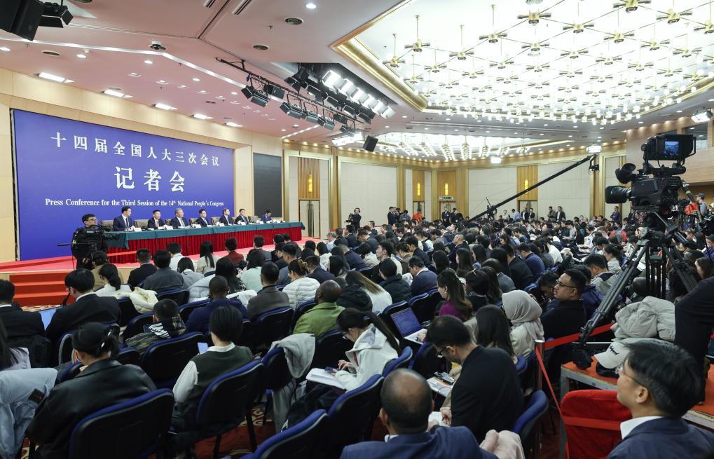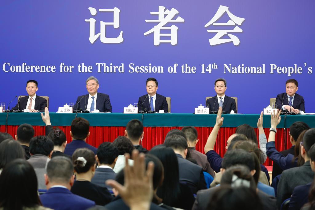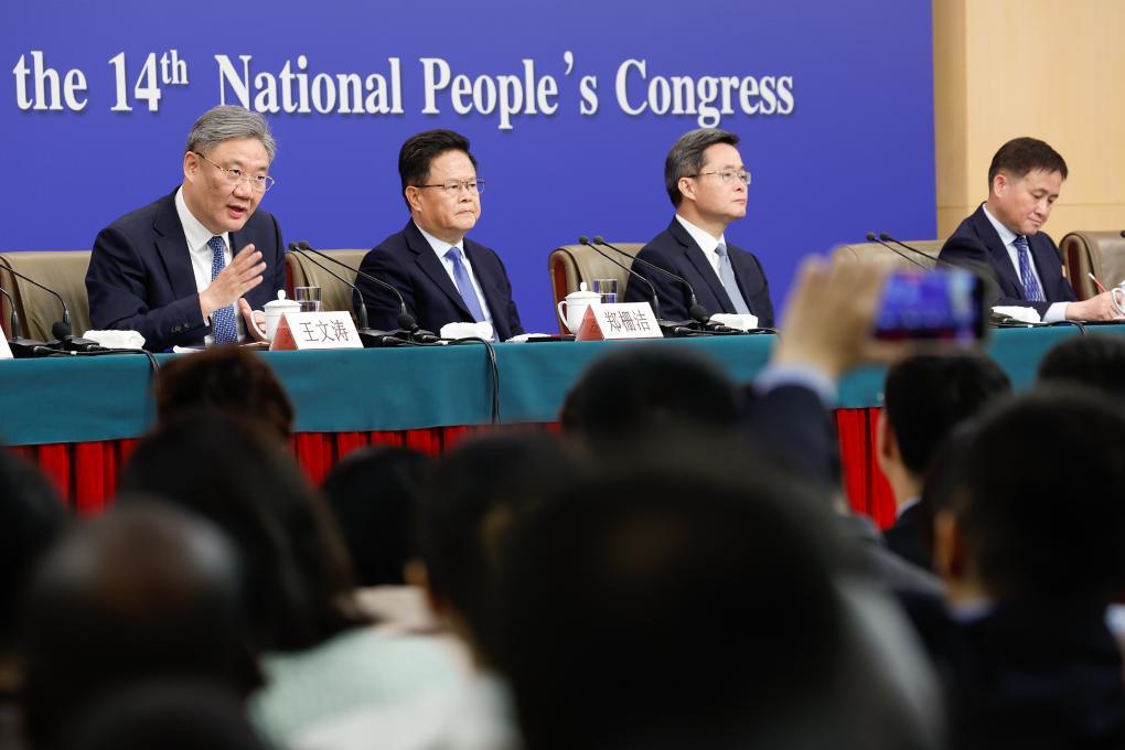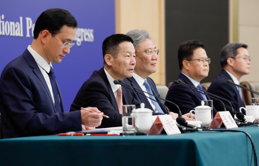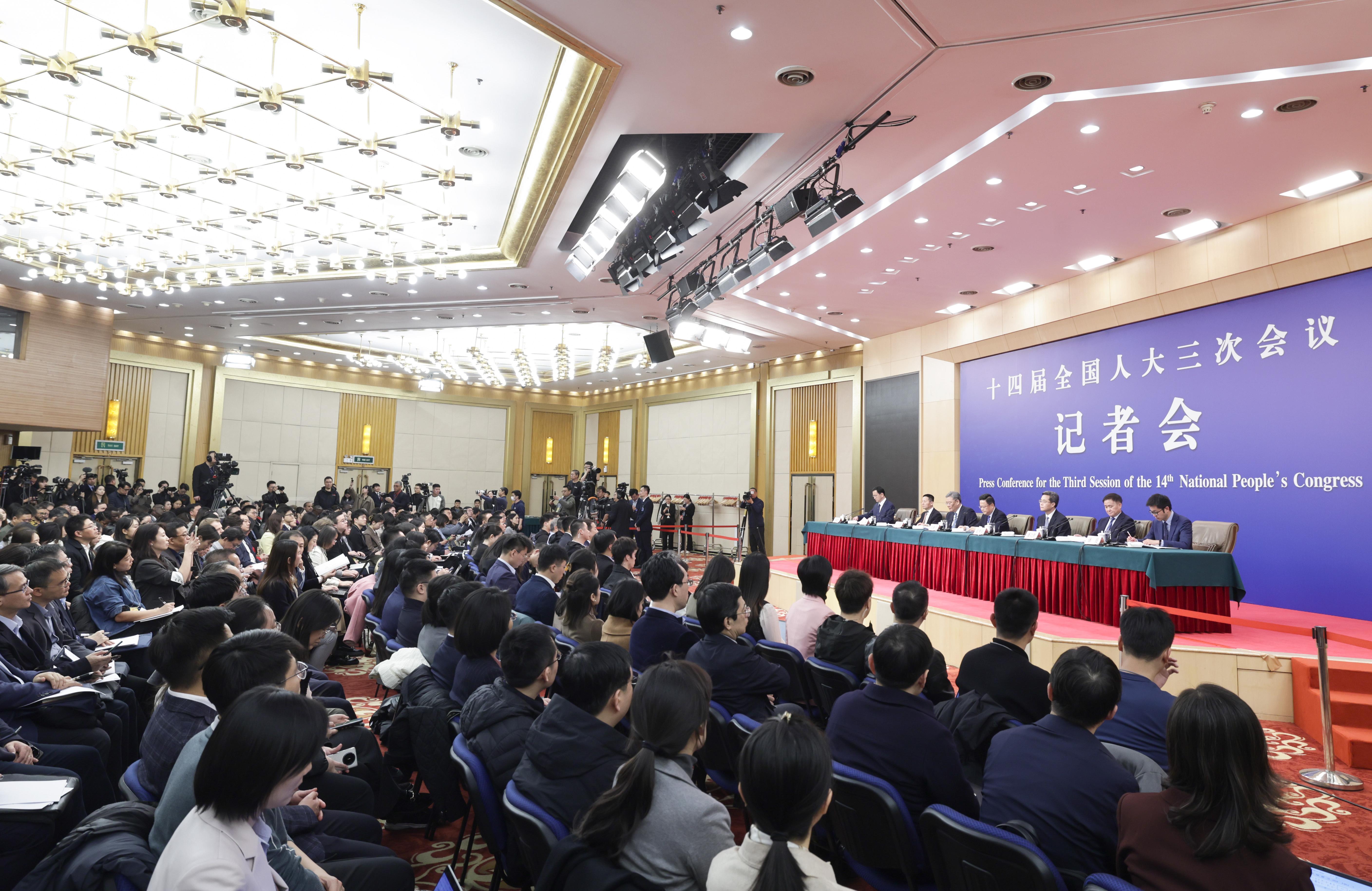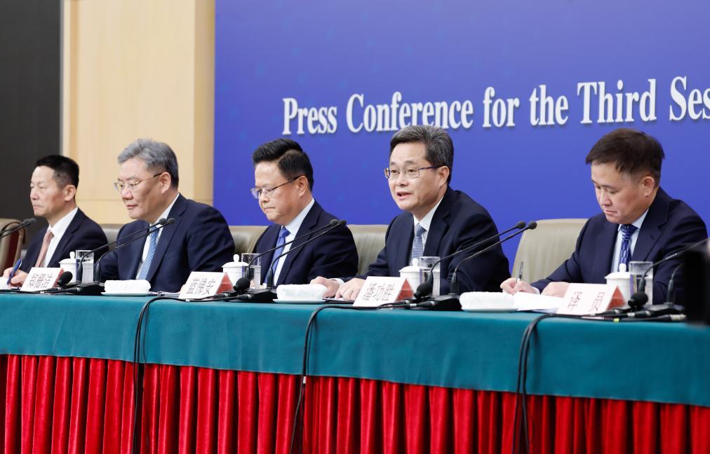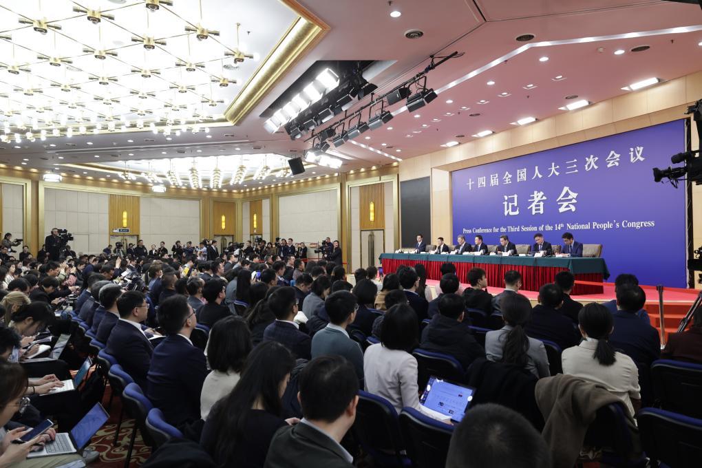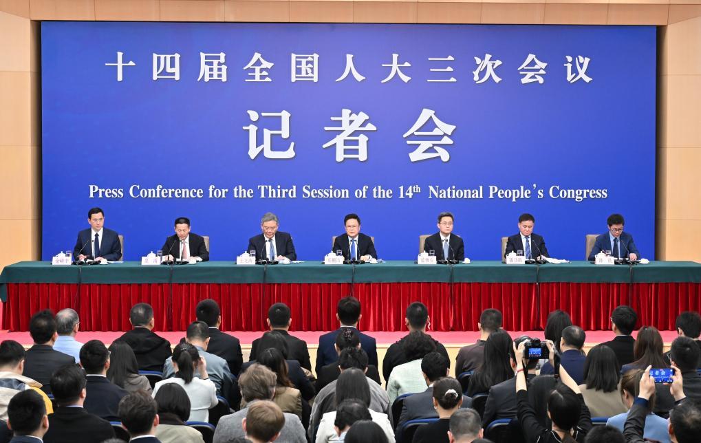 3月6日,十四屆全國人大三次會議在北京梅地亞中心新聞發(fā)布廳舉行記者會。國家發(fā)展和改革委員會主任鄭柵潔、財政部部長藍(lán)佛安、商務(wù)部部長王文濤、中國人民銀行行長潘功勝、中國證券監(jiān)督管理委員會主席吳清就發(fā)展改革、財政預(yù)算、商務(wù)、金融證券等相關(guān)問題回答中外記者提問。
