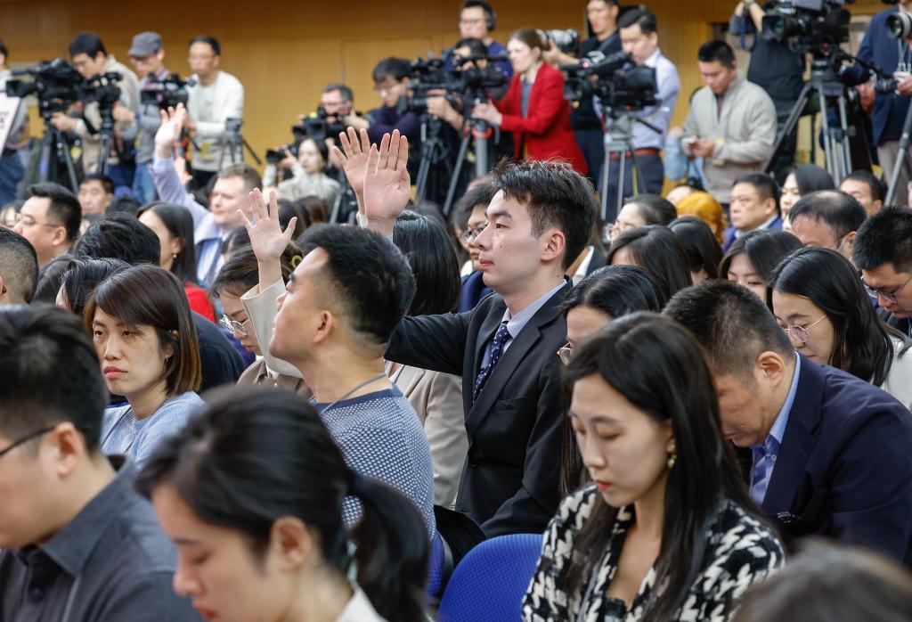 3月6日,十四屆全國人大三次會議在北京梅地亞中心新聞發(fā)布廳舉行記者會。國家發(fā)展和改革委員會主任鄭柵潔、財政部部長藍(lán)佛安、商務(wù)部部長王文濤、中國人民銀行行長潘功勝、中國證券監(jiān)督管理委員會主席吳清就發(fā)展改革、財政預(yù)算、商務(wù)、金融證券等相關(guān)問題回答中外記者提問。這是記者舉手提問。