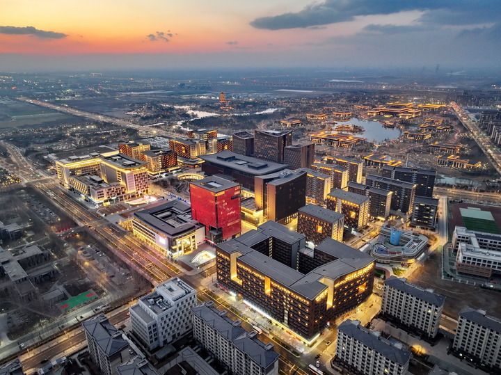 雄安商務(wù)服務(wù)中心夜景(2025年3月15日攝,無人機(jī)照片)。新華社記者 牟宇 攝