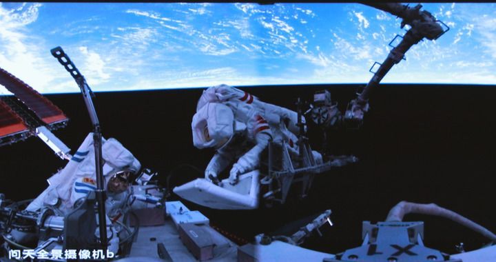 這是2025年6月26日在北京航天飛行控制中心屏幕上拍攝的神舟二十號航天員陳冬(左)與陳中瑞在空間站組合體艙外工作的畫面。新華社發(fā)(周柯毅攝)