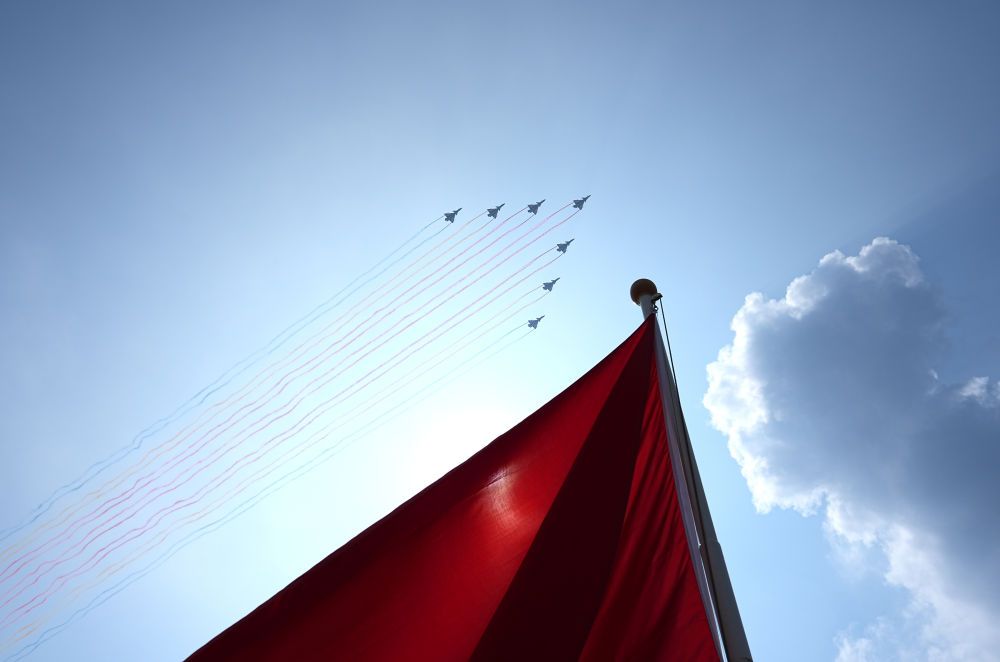 2025年9月3日,紀(jì)念中國人民抗日戰(zhàn)爭暨世界反法西斯戰(zhàn)爭勝利80周年大會在北京隆重舉行。這是教練機(jī)梯隊接受檢閱。新華社記者 朱崢 攝